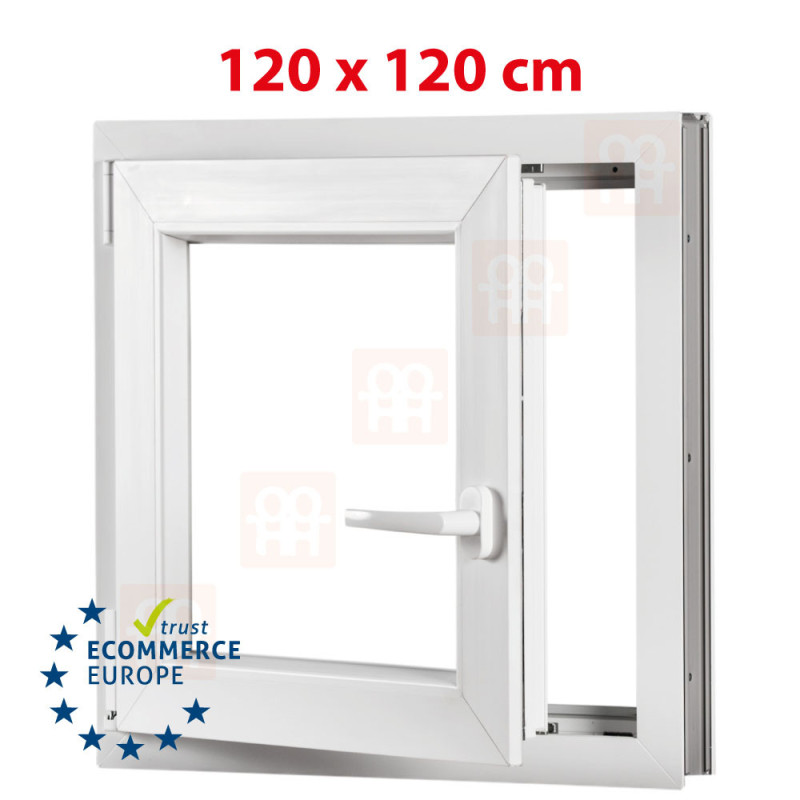 A kiváló minőségű 120 x 120 cm (1200 x 1200 mm) német Trocal profillal rendelkező műanyag ablak megfelel a hőszigeteléssel szemben támasztott magas követelményeknek, és ezáltal csökkenti a fűtési költségeket.